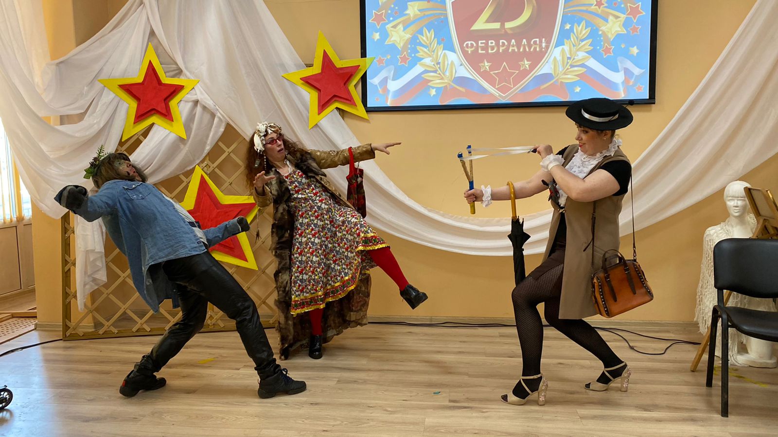 18 февраля в Центре народного творчества состоялась детская театрализованная игровая программа «Быстрый, смелый, ловкий или как Леший в Армию ходил», которую мы посвятили Дню Защитника Отечества. В этот праздник принято поздравлять людей имеющих прямое и косвенное отношение к службе в рядах вооруженных сил, не только мужчин, но и милых, сильных духом девушек и женщин. С учениками 1 «Г» класса МОУ СОШ №14, г. Уссурийск, ведущая программы Сафина Рузалия Айратовна, вдруг очутились в сказочном тридевятом царстве, где все с приходом модных трендов переменилось.
