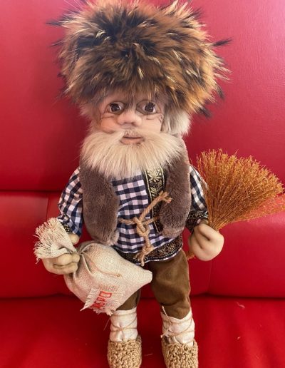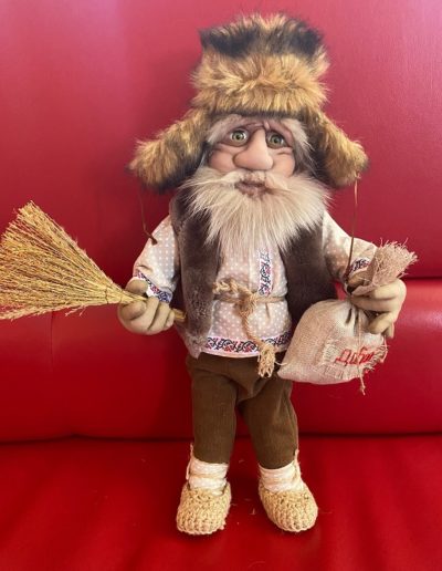 Выполнена кукла из материала- капрон и синтепон, дополнительно Татьяна Ивановна использовала в работе мех и добавила домовому веник и мешок.