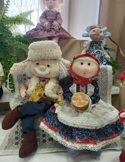 На выставку Елена предоставила более 10 кукол, а конкурсная работа «Встречаем Масленицу» успела поучаствовать и стать Лауреатом на конкурсе декоративно-прикладного творчества «Солнечная масленица», прошедшего в Центре народного творчества. Хлопок, трикотаж, синтепон, шерсть для валяния, бусины, шерстяная нить, акриловые краски, пастель, из этих материалов создана работа, а задекорирована -Блинчиками (расслоённый картон), салфеткой ручной работы, балалайкой из картона, покрашенного акриловыми красками, украшенной бисером, х/б нитью.