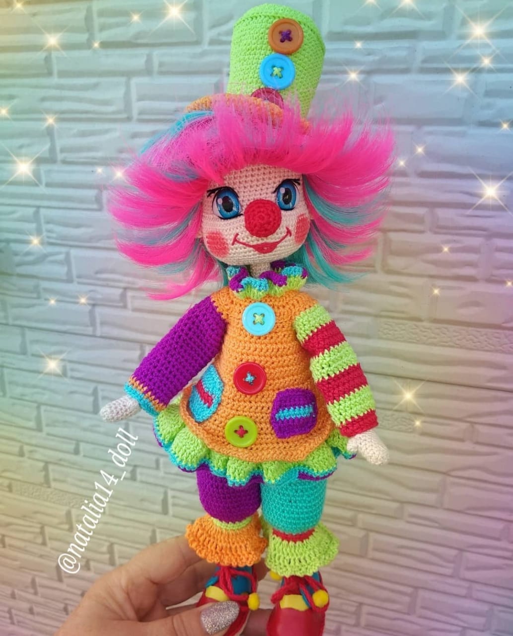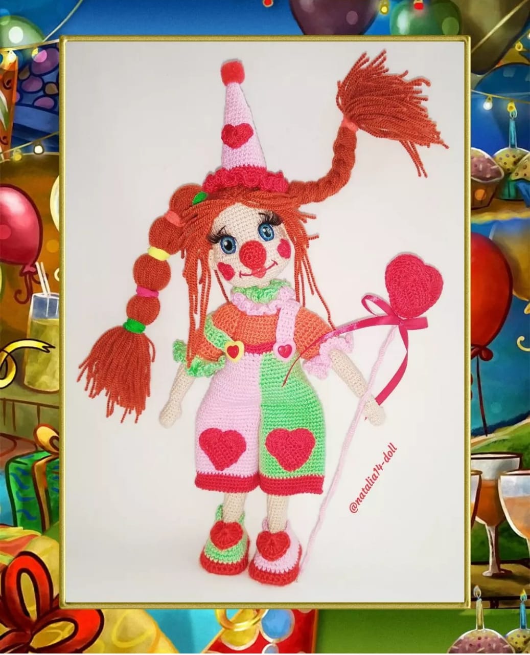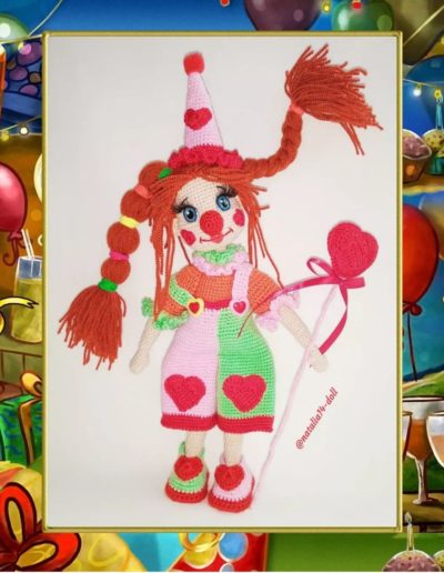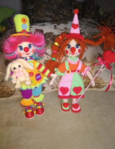 Авторская Композиция «Веселые Клоуны» Высота 25 см, год создания 2021-2022г, выполнена крючком из хлопка, на проволочном каркасе, одежда, обувь снимаются. За авторскую работу «Веселые клоуны» Наталья награждена дипломом   Лауреат 1 степени.