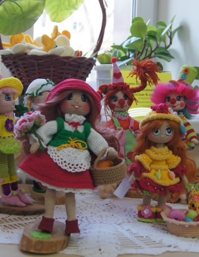 На выставку и конкурс «Приморская красавица», Наталья Георгиевна представила работы: Кукла «Красная шапочка» «. Высота 25 см Выполнена из 100 процентного хлопка. Кукла с поворотной головой на каркасе, в руках которой корзинка с пирожками, все вязанное крючком. Одежда снимается Все куклы сделаны в единственном экземпляре. Наталья изготавливает: авторскую куклу, интерьерную куклу, игровую куклу.