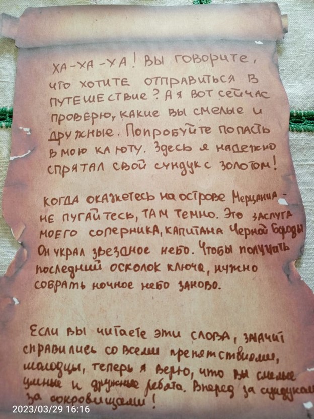 29 марта в ДК с.Корсаковка прошла квест-игра «Клад пиратов». Квест – уникальная возможность почувствовать себя искателем сокровищ, капитаном корабля, вождем племени или шпионом. Цель мероприятия – создание благоприятного эмоционального состояния у детей, активизация их мышления, внимания; привлечение к совместной работе со сверстниками. Ребятам вместе с ведущей предстояло найти части ключа, собрать его и отыскать клад. Бесстрашные ребята отправились в путешествие на корабле, на встречу с настоящими пиратами. Их ждали множество испытаний, из которых они выходили еще более смелыми, находчивыми. Когда все части ключа были собраны, дети сложили его и смогли открыть сундук с сокровищами. Игра прошла в тёплой дружеской атмосфере. Участники очень сплотились во время игры. Все получили отличный заряд бодрости и море положительных эмоций.