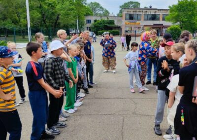 На праздник в гости к детям пришли веселые клоунессы Кнопа и Клёпа. В ярких, красочных костюмах встретили ребят гостьи, которые вызвали у них много бурных и веселых эмоций, а также улыбок и смеха. Праздник сопровождался веселыми конкурсами. Для начала – знакомство-кричалка, затем игры с обручами, мячиками, загадки, веселые вопросы, заводные танцы и еще много других заданий приготовили для участников клоунессы.
