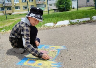 Также, ребятам предложили нарисовать цветными мелками картину-пожелание, на которой они могли изобразить все, что им хотелось бы пожелать другим детям. Юные художники нарисовали солнце, цветы, небо, птиц и многое другое.