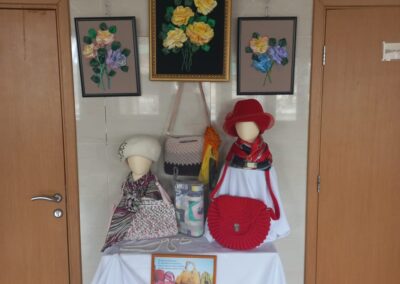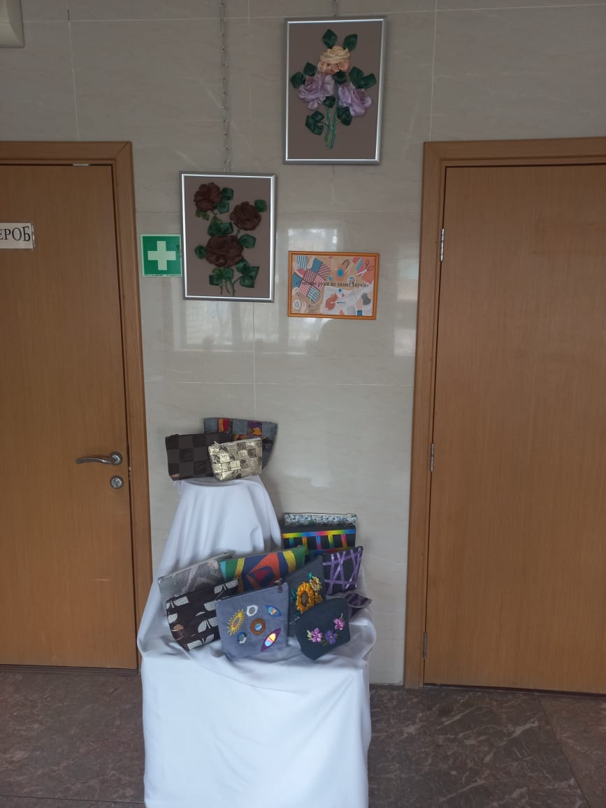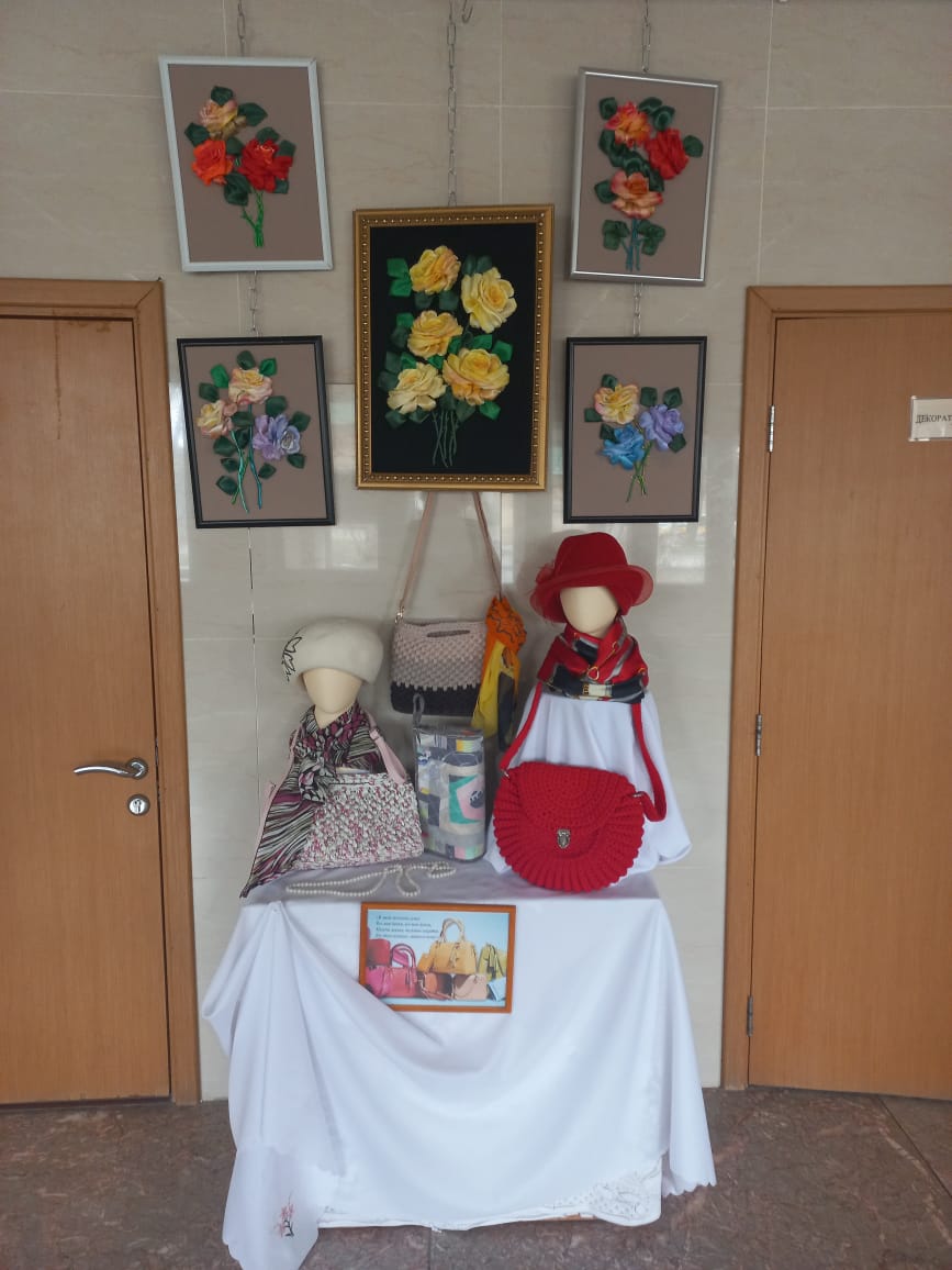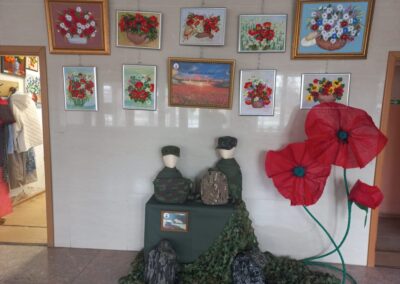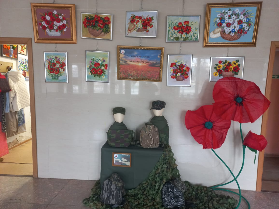 В фойе учреждения разместилась выставка работ участников кружка ДПТ «Мастерская рукоделия», основная экспозиция которой «…красные маки – горькая память земли…» посвящена 80-летию Великой Победы.