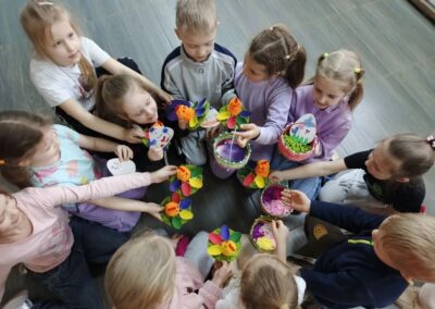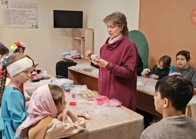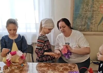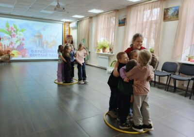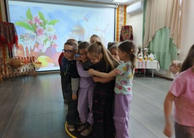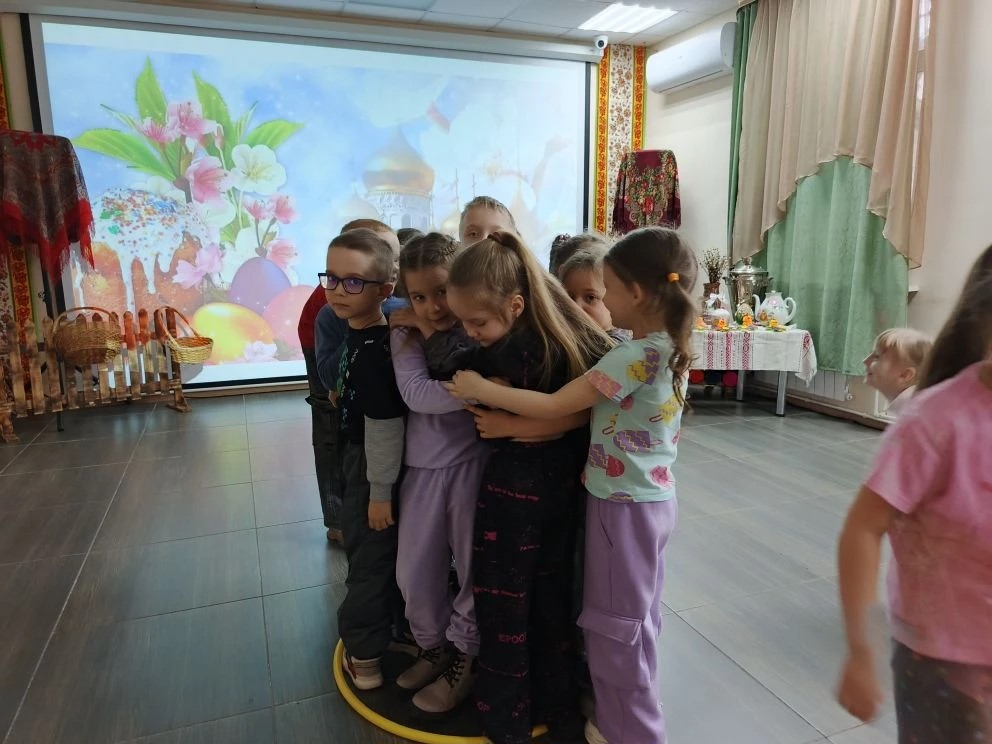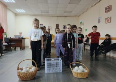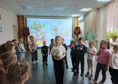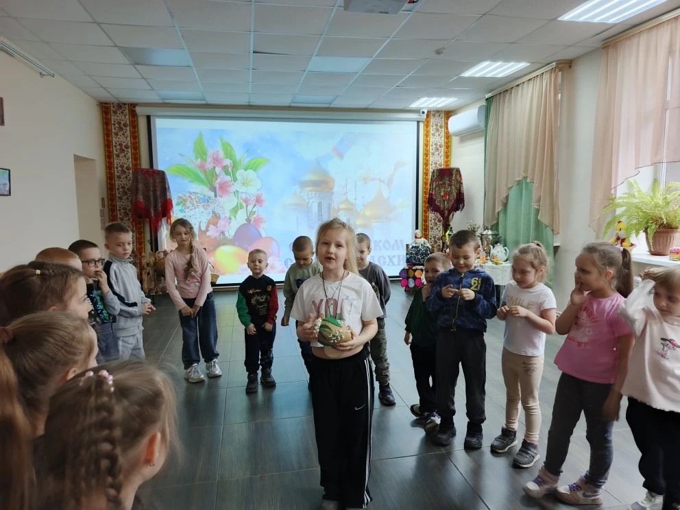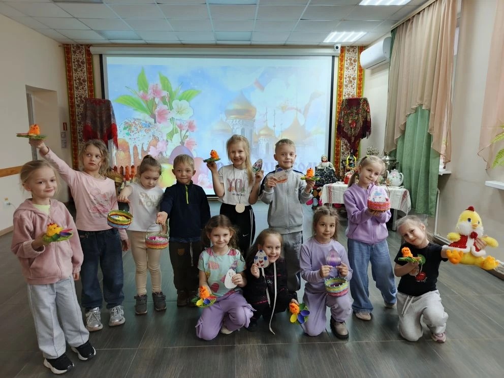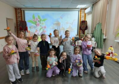 В программе праздника нашлось место и познавательным, и творческим, и подвижным занятиям. Дети с азартом отвечали на вопросы викторины о Пасхе, вспоминали главные символы праздника — крашеное яйцо и кулич, а также весенние приметы. Особенно понравились ребятам игры «Тихий ручеёк» и «Весеннее гнездышко», которые учили внимательности, аккуратности и умению действовать сообща.