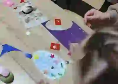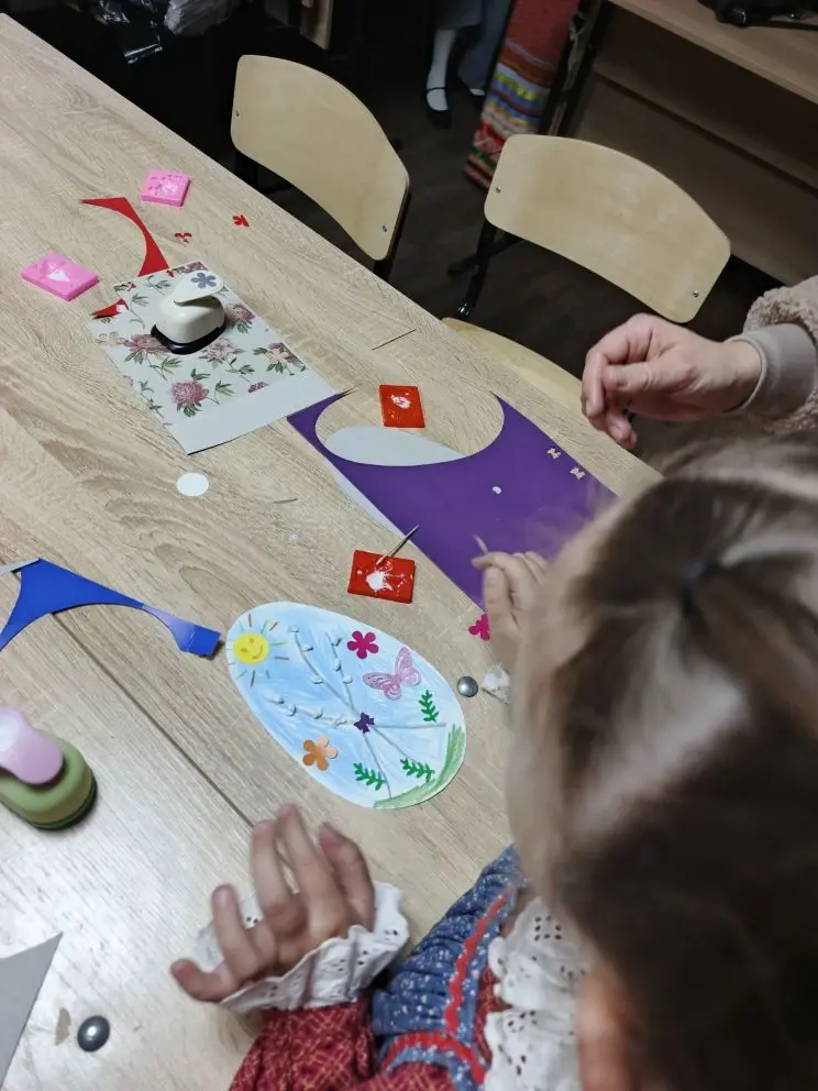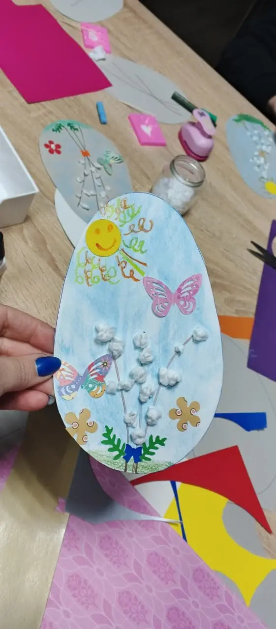 Наталья Толмачёва — участница клуба, талантливая рукодельница — предложила юным гостям создать яркую аппликацию «Пасхальное яйцо» из картона. Дети с большим интересом оформляли свои работы, а одна из участниц вместе с мамой тут же поинтересовалась, где можно приобрести необходимые инструменты (фигурный дырокол, мелки) для продолжения занятий дома. Это лучшая похвала для любого мастера!