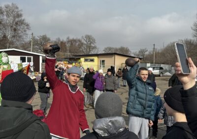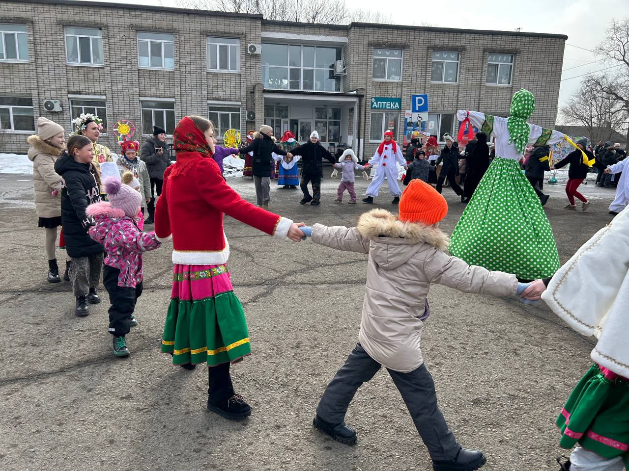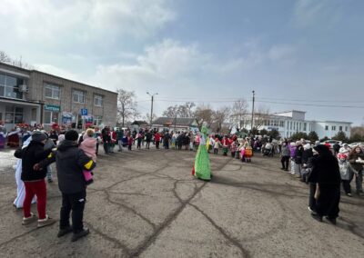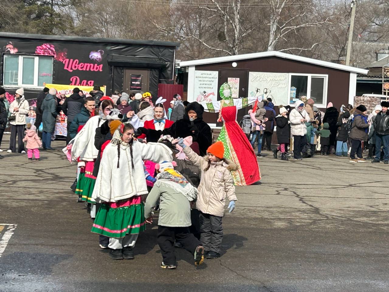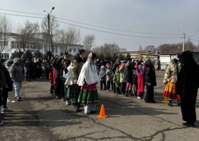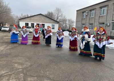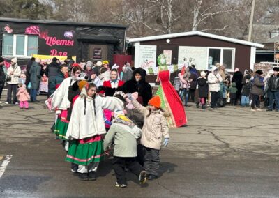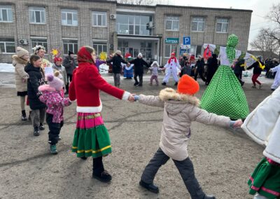 Небольшая театрализация с использованием современных трендов переросла в традиционные гуляния с фольклорными играми и хороводами, забавами – бой мешками, перетягивание каната, силовыми конкурсами. Особенно весело было в командных состязаниях, где стар и млад соревновался в хоккее со снежками, скачке на лошадках, метании валенок и многом другом.
